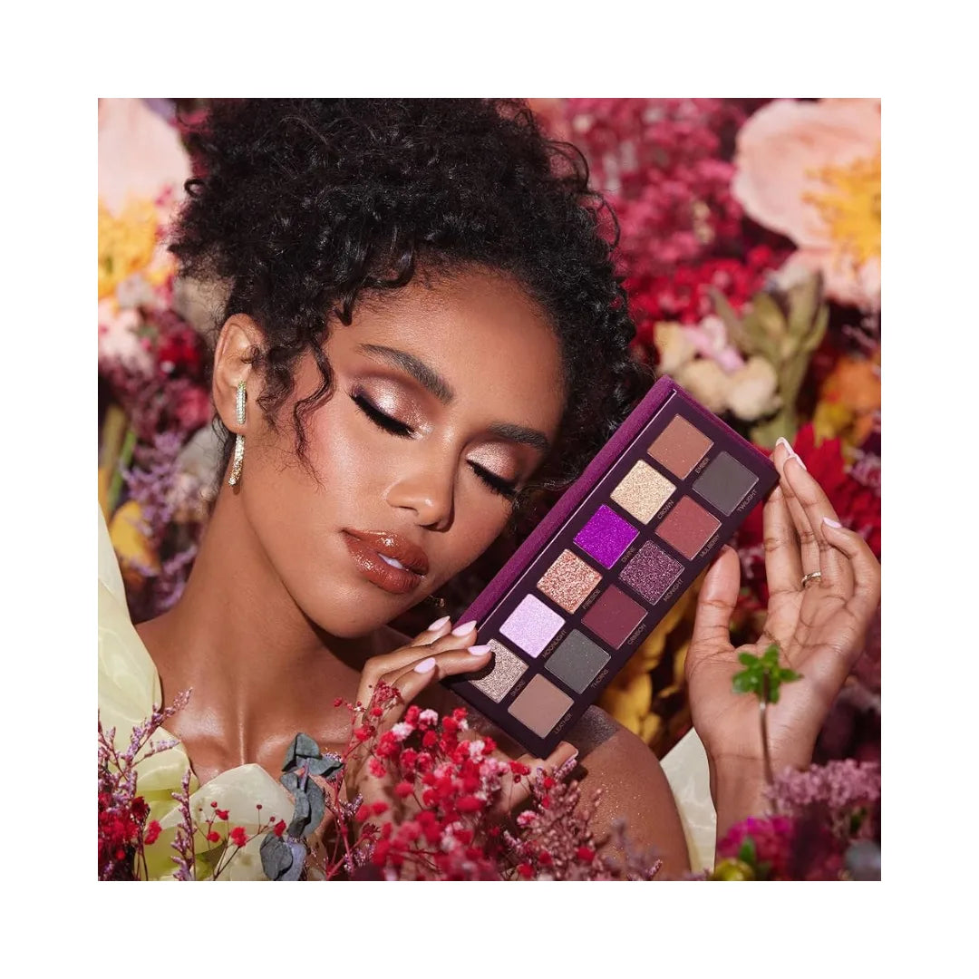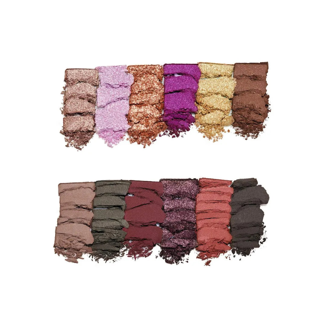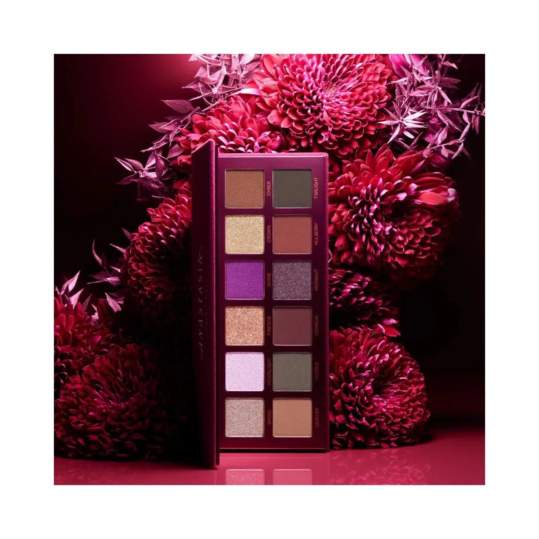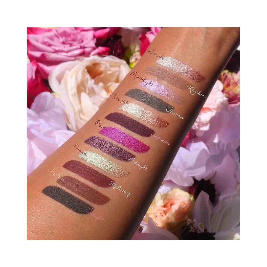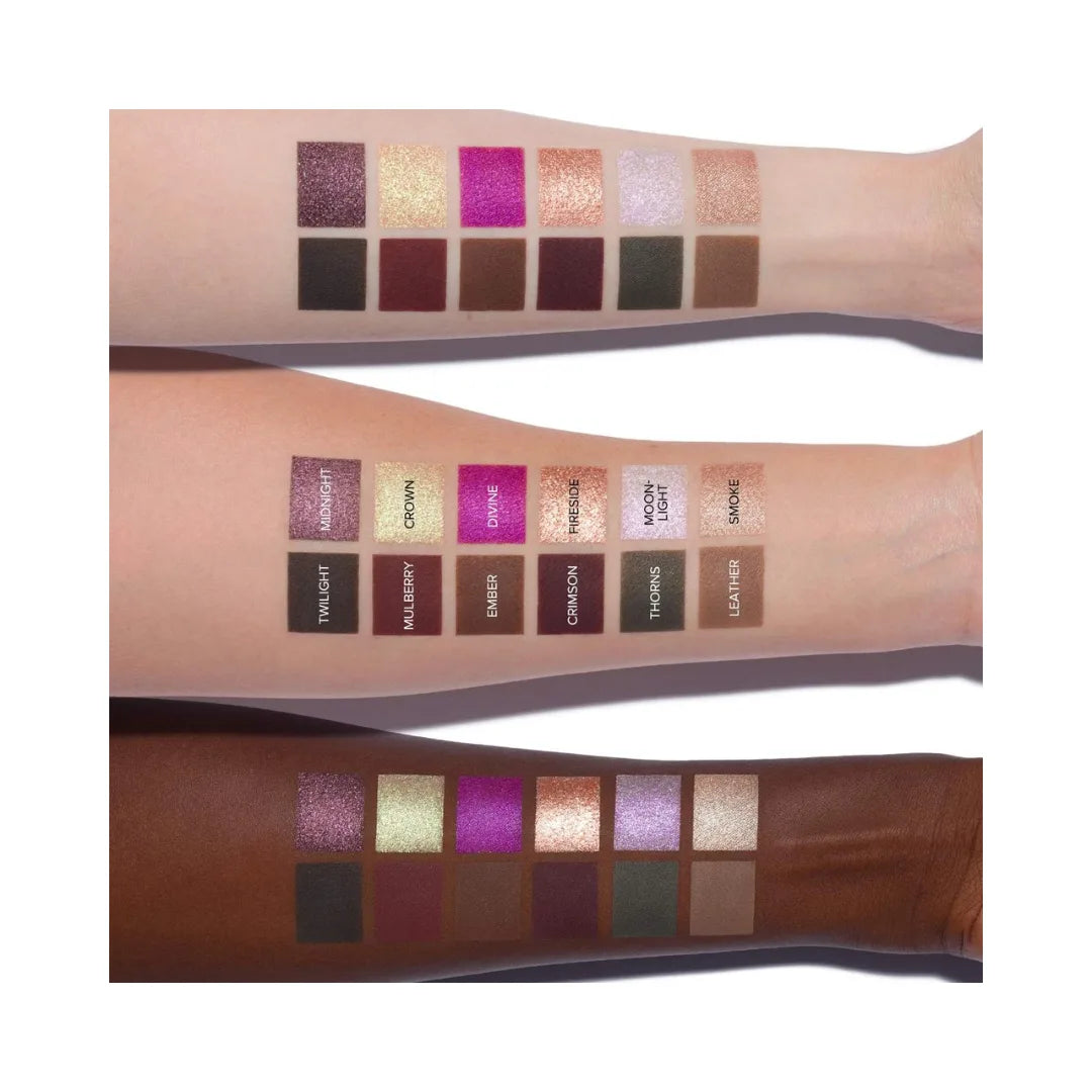 - 12 x Eyeshadows in Smoke (metallic, silverish taupe with green-gold reflects), Moonlight (duochrome lavender with a sparkling pink-opal shift), Fireside (metallic rosy copper with sparkling reflects), Divine (duochrome vivid purple with a sparkling pink-pearl shift), Crown (duochrome gold with a sparkling green-blue shift), Ember (matte toasted brown with fiery reflects), Leather (matte stone), Thorns (matte hunter green with sparkling reflects), Crimson (matte deep wine), Midnight (metallic, smokey purple with sparkling reflects), Mulberry (matte reddish brown with sparkling reflects), Twilight (matte, deep greyish green)