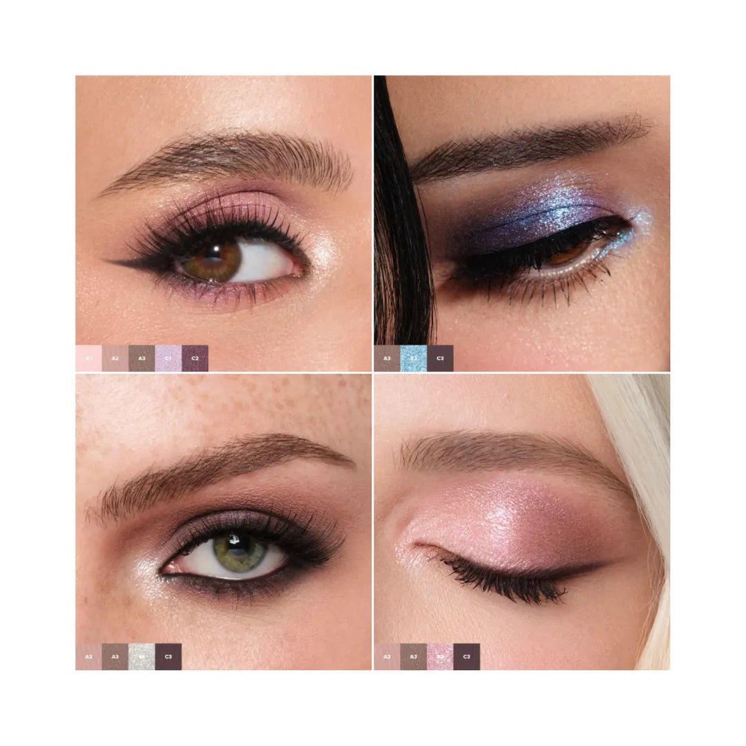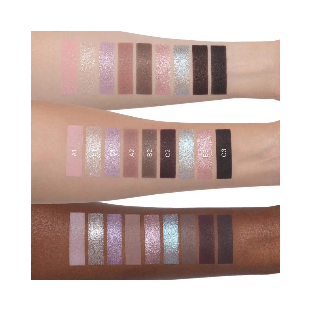 -9 x Eyeshadows in A1 (matte nude pink), A2 (matte taupe beige with sparkling reflects), A3 (matte greyish brown with sparkling reflects), B1 (sparkling silver with duo-chrome reflects), B2 (sparkling pink with duo-chrome reflects), B3 (sparkling blue with duo-chrome reflects), C1 (metallic icy purple with sparkling reflects), C2 (matte deep purple with pink reflects), C3 (matte deep-charcoal brown)