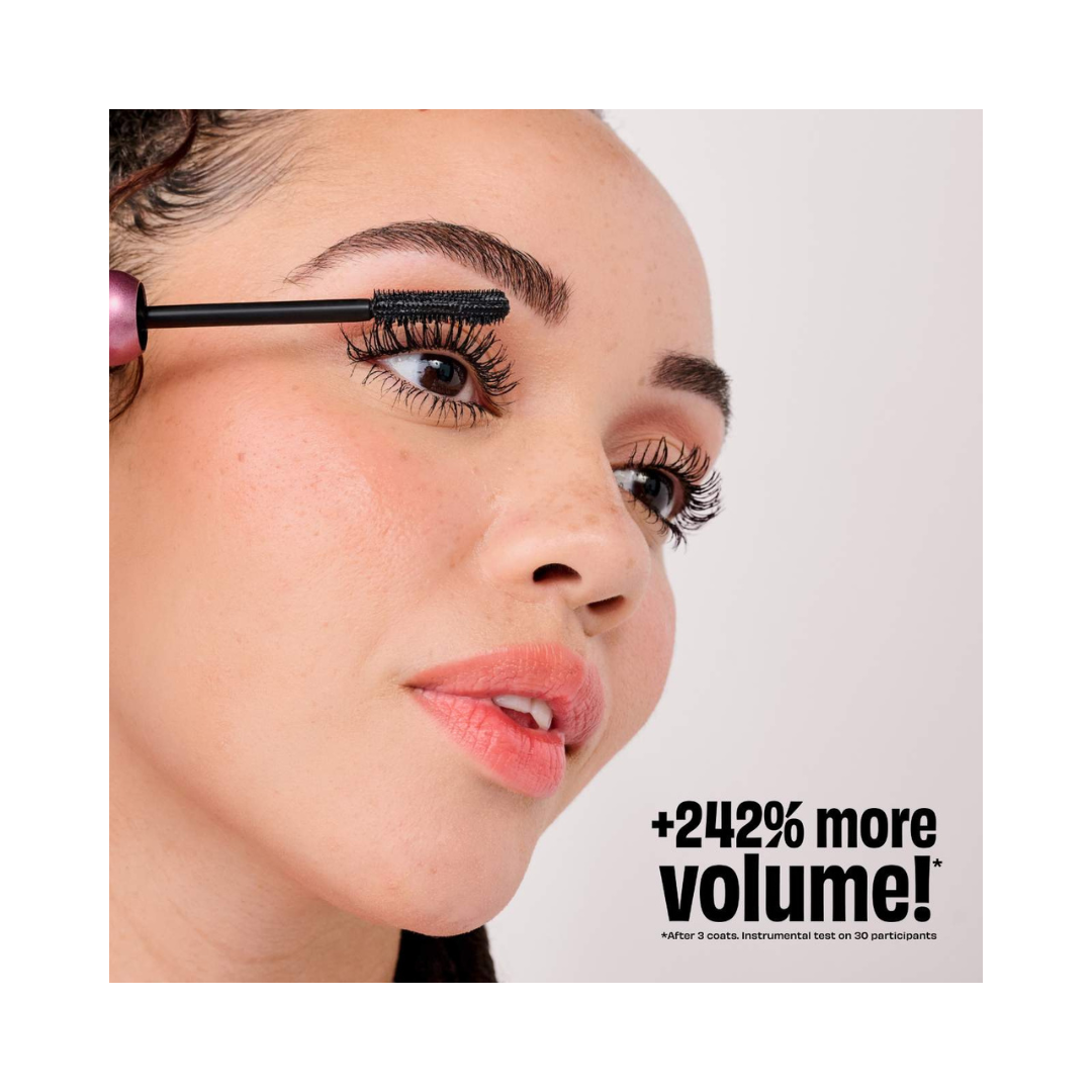 What it is: A volumizing mascara with a dual-sided brush; bristle side boosts volume by 242%, comb side separates & defines for fuller, flake & clump free lashes. This mascara has a custom-engineered hybrid brush, fiber bristles build full volume, then flip to the fine-tooth comb for separation & definition. The result? Big, bouncy volume paired with conditioning properties that resist clumping and flaking for 24-hours.