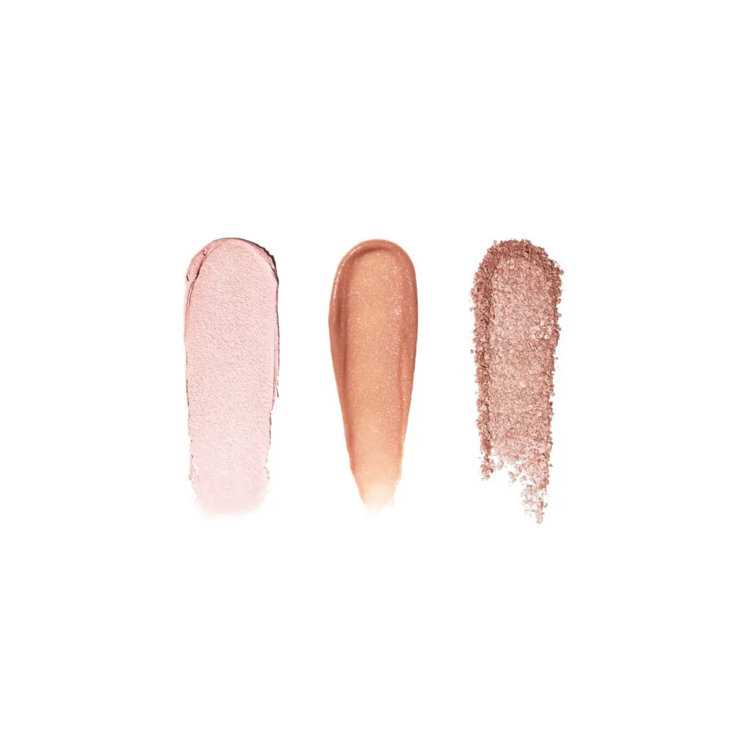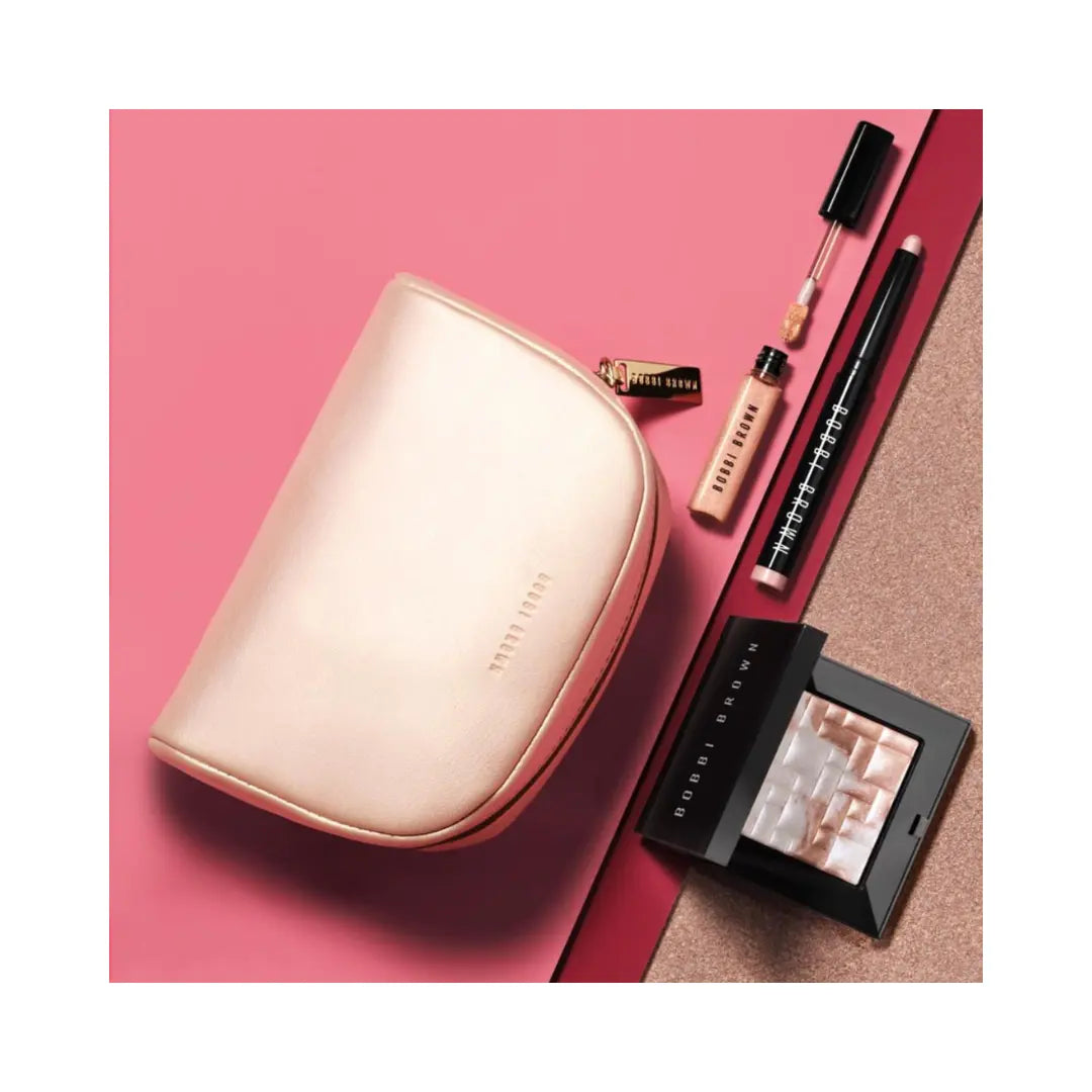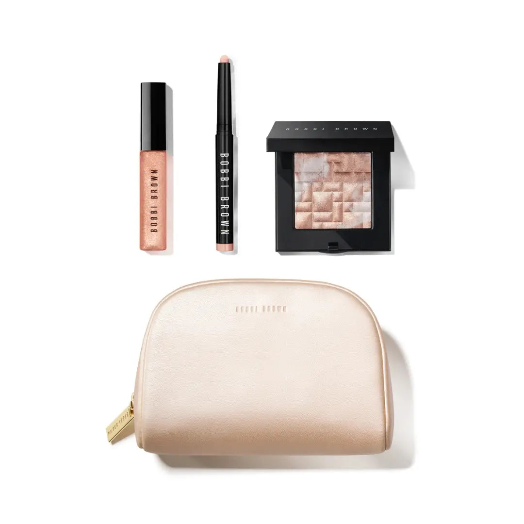 What it is: A makeup set trio of luminous favorites for cheeks, eyes, and lips, plus a makeup bag for taking your glow to go. Add a high-impact glow to skin with our pearl-infused Highlighting Powder. Swipe flattering shimmer onto the lid with our 24-hour Long-Wear Cream Shadow Stick in Golden Pink. Complete the lit-from-within look with our nourishing Crushed Oil-Infused Gloss Shimmer for an ultra-shiny, non-sticky wash of sparkling color.
