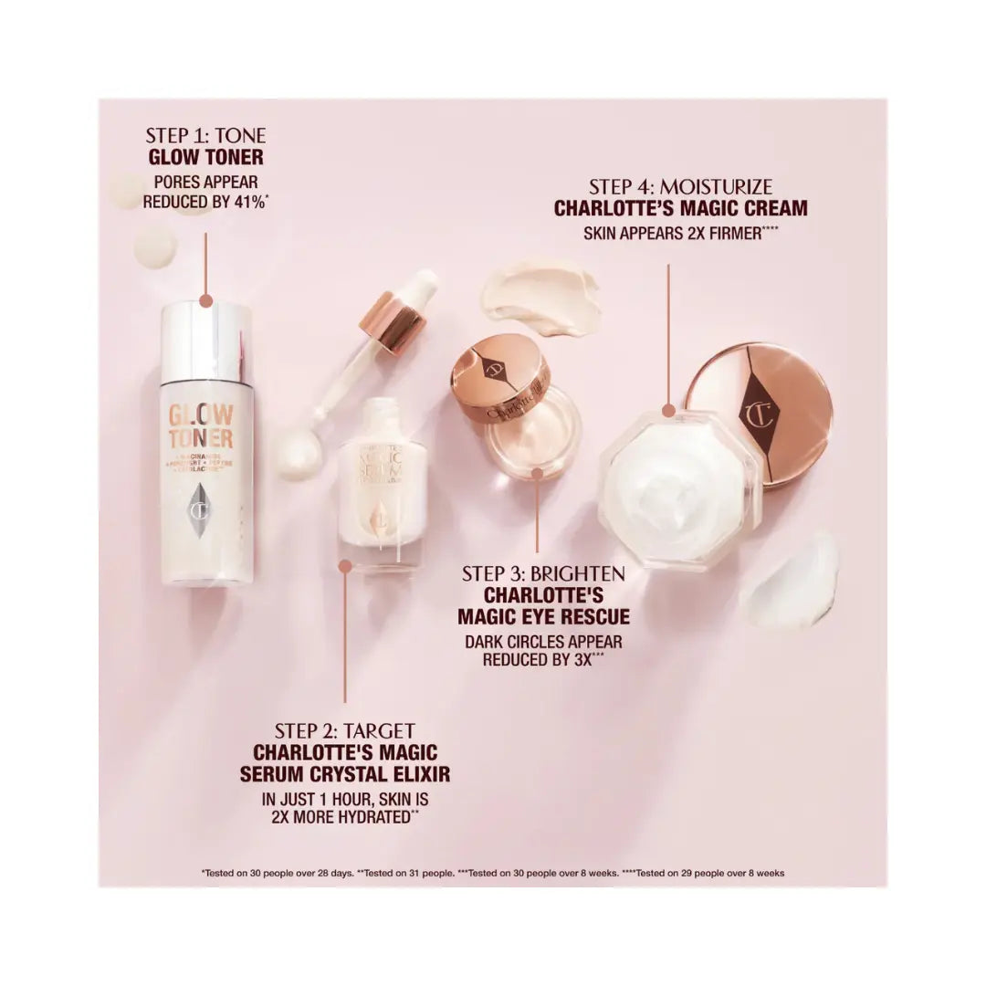 What it is: Start your glowing skin journey with this efficacious four-step immediate skin revival routine. This mini value set includes a pore-refining toner, brightening serum, firming eye cream, and an award-winning anti-aging moisturizer that work in synergy to create the perfect canvas for makeup.