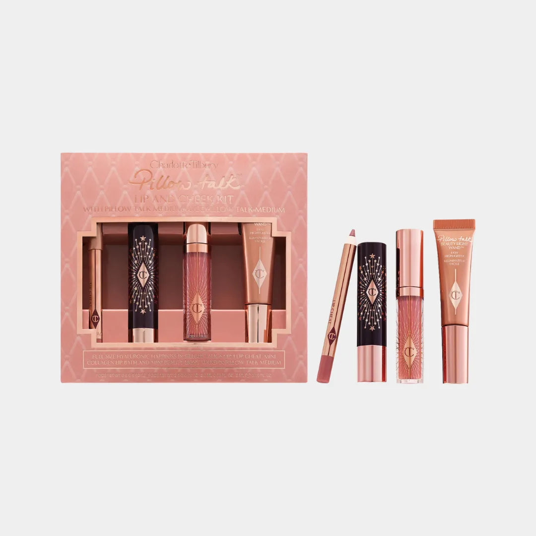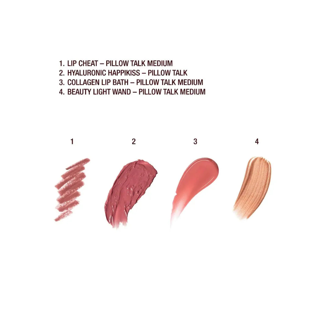 What it is: A four-piece set of Pillow Talk icons featuring a full-size Hyaluronic Happikiss and travel-size Lip Cheat, Collagen Lip Bath, and Beauty Highlighter Wand.