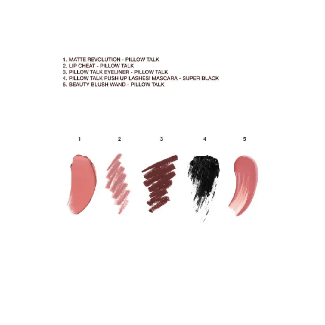 What it is: Take your next eye look to MUA-worthy heights with the Pillow Talk Eyeliner, a berry-brown pencil boasting a creamy texture that glides onto the lid for a show-stopping finish. Top this off with a coat of the Pillow Talk Push Up Lashes! Mascara in 'Super Black', formulated to boost the appearance of length and volume for a statement-making flutter. Next, two essentials that needs no introduction, the Lip Cheat in 'Pillow Talk Original' and the Matte Revolution Lipstick in 'Pillow Talk Original' promise a perfectly pink pout, while the always-sells-out Mini Matte Beauty Blush Wand in 'Pillow Talk' completes the look.
