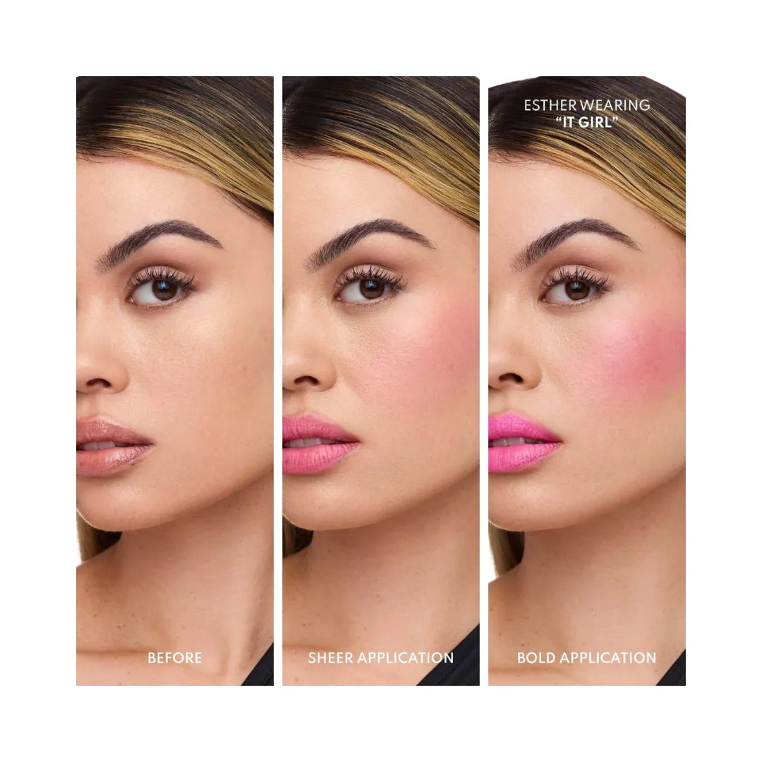 Tap on “Universal” to prime, set, and blur complexion. Then, add a flush of color using “It Girl” to your cheeks and lips.
