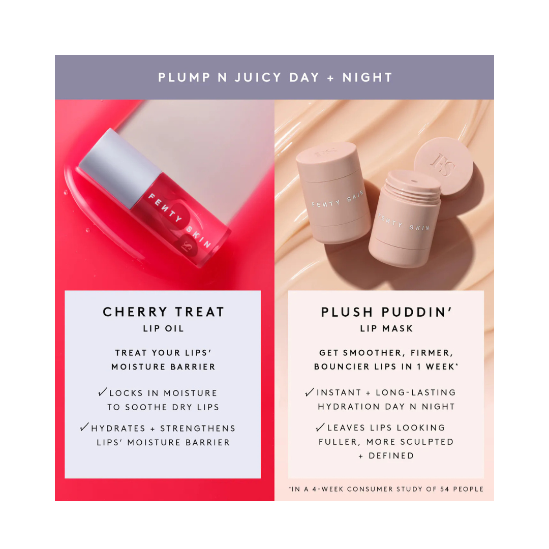 What it is: The ultimate lip care pair for super-soft lips sealed with a kiss. Treat your pout to a stronger moisture barrier with Fenty Treatz. Boost lips’ smoothness, firmness and bounce with Plush Puddin’. Put these thirst-quenching treats on repeat to keep your lips plump and juicy day and night.