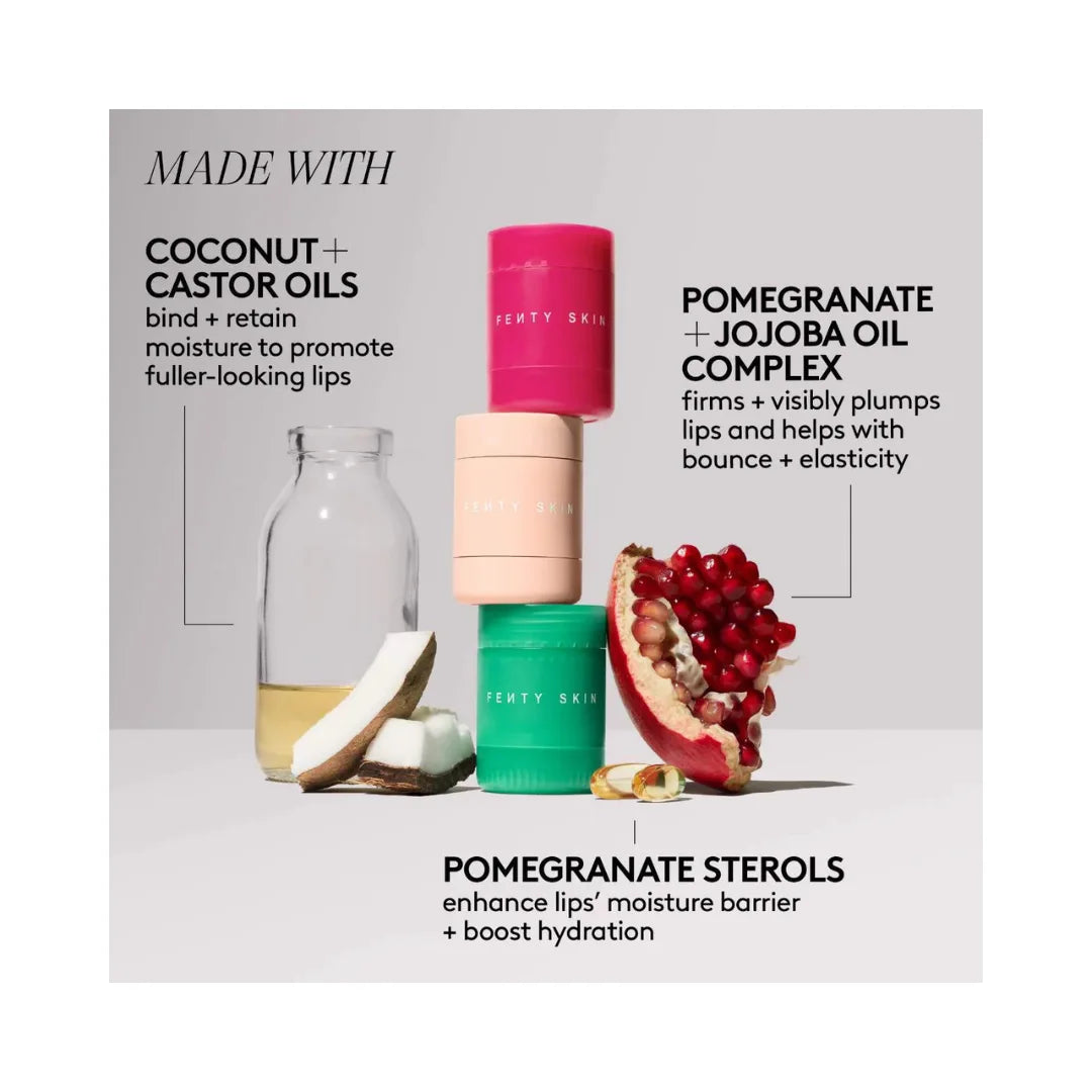 -Pomegranate + Jojoba Oil Complex: Antioxidant-rich; visibly firms and plumps lips and helps with the look of bounce and elasticity.