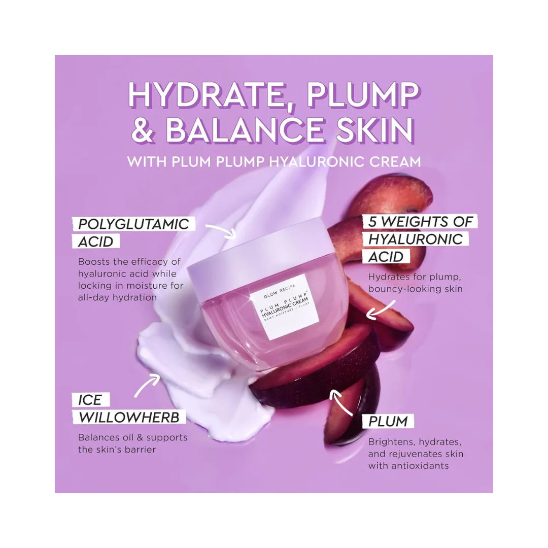 Plum Plump Hyaluronic Acid Moisturizer (50ml):Water/Aqua/Eau, Propanediol, Glycerin, C13-15 Alkane, Caprylic/Capric Triglyceride, C9-12 Alkane, Prunus Domestica Seed Oil*, Pentylene Glycol, Squalane, Terminalia Ferdinandiana Seed Oil*, Hyaluronic Acid, Sodium Acetylated Hyaluronate, Sodium Hyaluronate, Davidsonia Jerseyana Fruit Extract*, Terminalia Ferdinandiana Fruit Powder*, Podocarpus Elatus Fruit Extract*, Polyglutamic Acid, Pleiogynium Timoriense Fruit Extract*, Sodium Hyaluronate Crosspolymer, Hydrolyzed Sodium Hyaluronate, Epilobium Fleischeri (Alpine Willowherb) Flower/Leaf/Stem Extract, Niacinamide, Acrylates/C10-30 Alkyl Acrylate Crosspolymer, Xylitylglucoside, Isononyl Isononanoate, Caprylyl Glycol, Anhydroxylitol, Cetearyl Alcohol, Glyceryl Stearate, Arginine, Ethylhexylglycerin, Sodium Chloride, Xylitol, Stearic Acid, Tremella Fuciformis Polysaccharide, Sodium Lauroyl Glutamate, Eclipta Prostrata Extract, Glucose, Potassium Phosphate, Butylene Glycol, Melia Azadirachta Leaf Extract, Hydroxypropylcellulose, Alaria Esculenta Extract, Sodium Phosphate, Potassium Chloride, Melia Azadirachta Flower Extract, Corallina Officinalis Extract, 1,2-Hexanediol, Moringa Oleifera Seed Oil, Coccinia Indica Fruit Extract, Citric Acid, Potassium Sorbate, Solanum Melongena (Eggplant) Fruit Extract, Aloe Barbadensis Flower Extract, Gluconolactone, Simmondsia Chinensis (Jojoba) Seed Oil, Curcuma Longa (Turmeric) Root Extract, Ocimum Basilicum (Basil) Flower/Leaf Extract, Ocimum Sanctum Leaf Extract, Silica, Sodium Hydroxide, Sodium Benzoate, Phenoxyethanol, Fragrance/Parfum**. *Plum Extracts/Oils **Natural Fragrance.