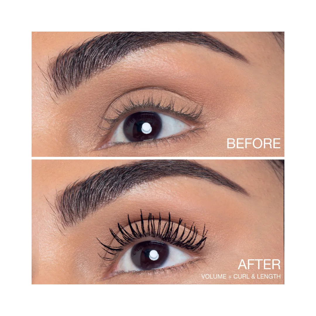 This dual-sided mascara features two full size brushes and formulas designed to give you the perfect lashes. Whether you use both sides together or separately, this mascara allows you to customize your look according to your mood. The "Volume" side: This formula features low-gravity fibers for a volume beyond belief without the weight or stiffness. The "Curl and Length" side: This formula includes gripping waxes and fibers for an immediately elongated effect with a curved brush to boost length, definition, and curl to even your tiniest lashes.