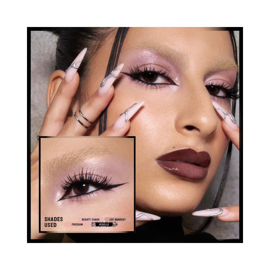 -18 x Eyeshadows in Liberty (burnt peach matte), Heroine (light peach matte), Avant-Garde (deep-black and gold-powder metallic), Renegade (ultra-black, creamy metallic), Brave (mauve matte), Beauty Chaos (lilac matte), Rise Up (neutral brown matte), Stand Up (copper-powder metallic), Strong AF (silver-black/purple, creamy marble metallic), Nirvana (eggplant-brown matte), Hope (deep, neutral brown matte), Haphazard (multichromatic shimmer drops), Fearless (purple-brown matte), Luv Anarchy (taupe matte), Maverick (creamy silver metallic), Rebelle (multichromatic shimmer flakes), Freedom (purple-gray matte), Grunge (black eye gloss)