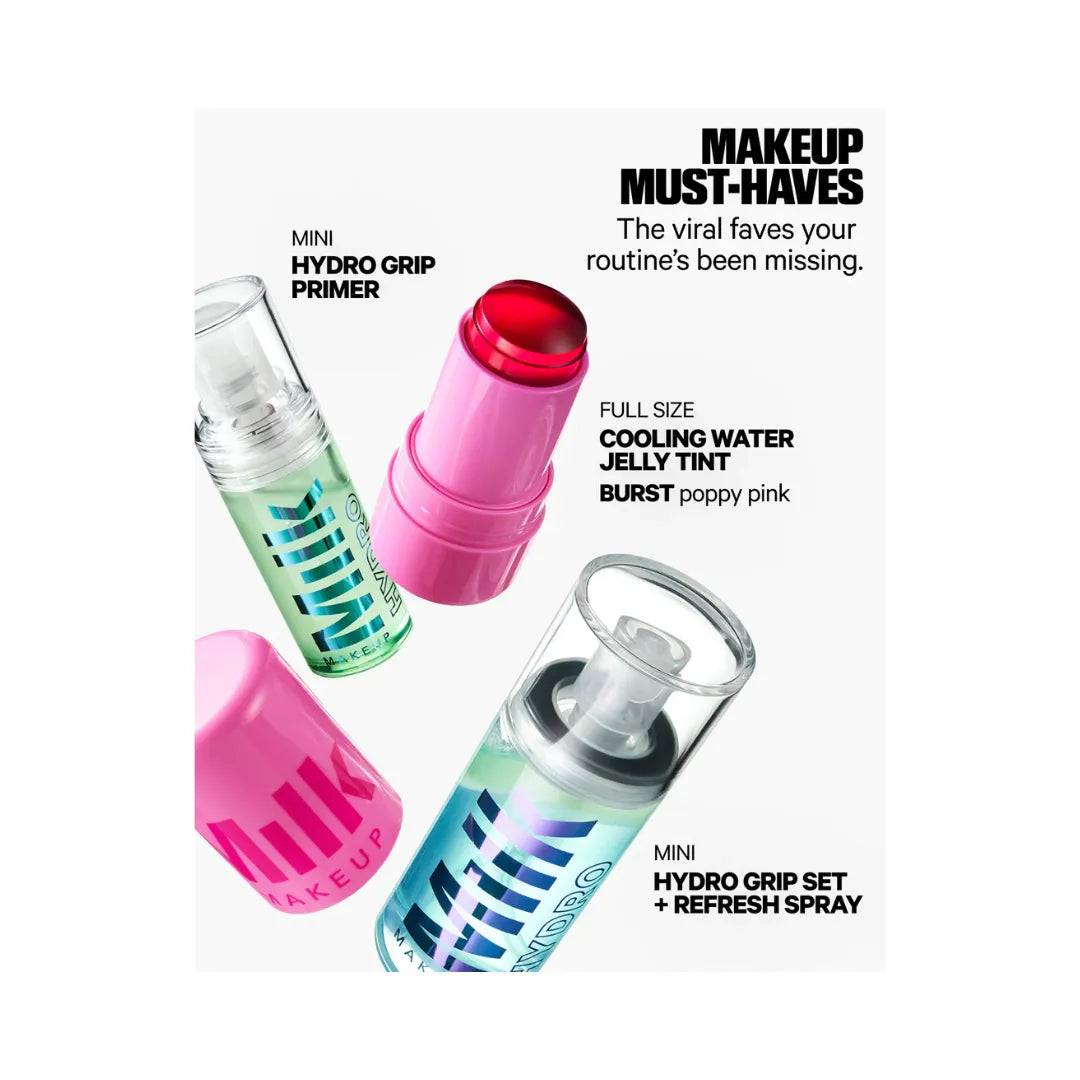 Includes a travel size Hydro Grip Primer, full size Cooling Water Jelly Tint in Burst (poppy pink), and travel size Hydro Grip Set + Refresh Spray.