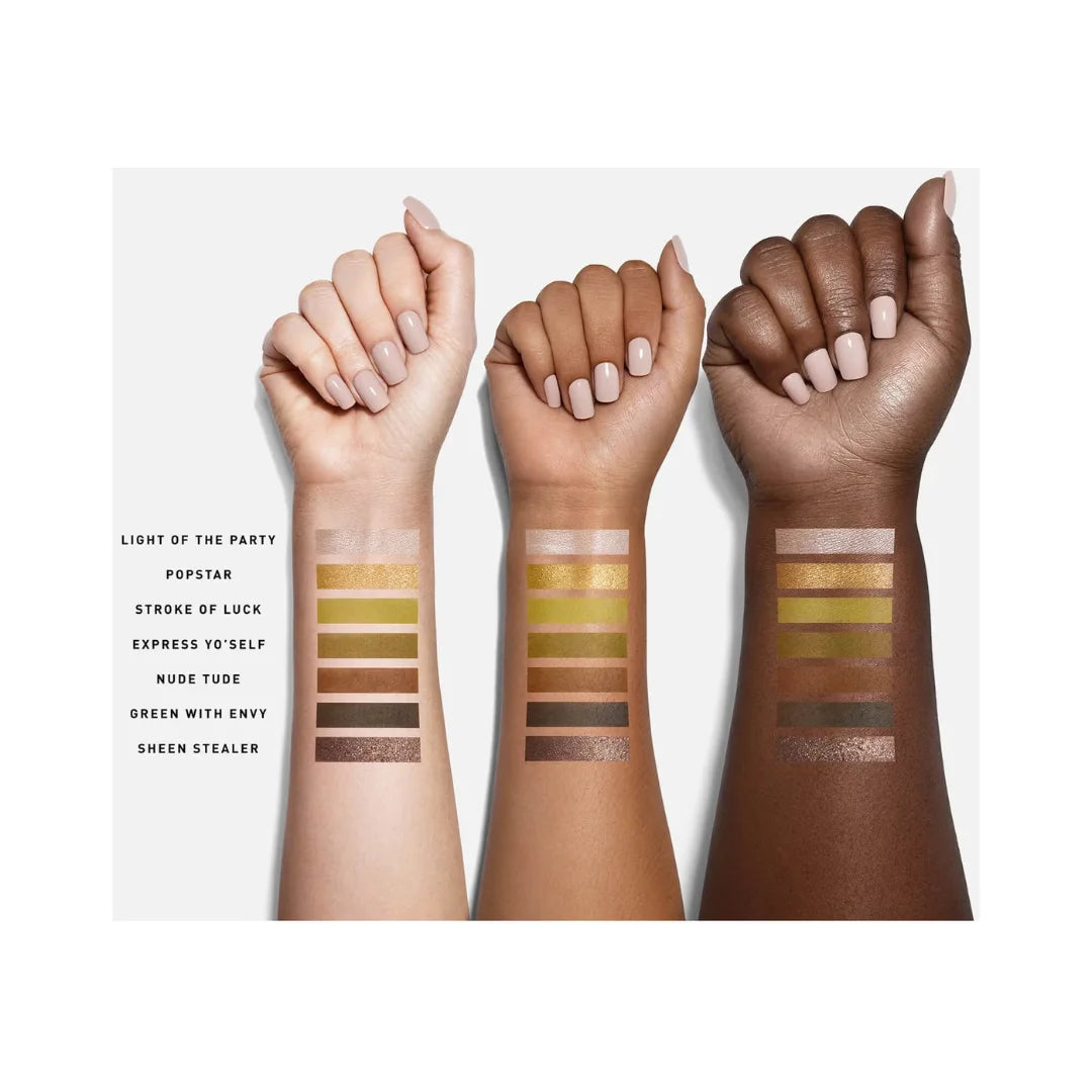 Row 1: Light of the Party (frosted cream shimmer), Popstar (metallic gilded gold), Stroke of Luck (matte wasabi green), Express Yo’self (matte moss), Nude Tude (matte olive), Green with Envy (matte midnight green), Sheen Stealer (metallic burnt olive)