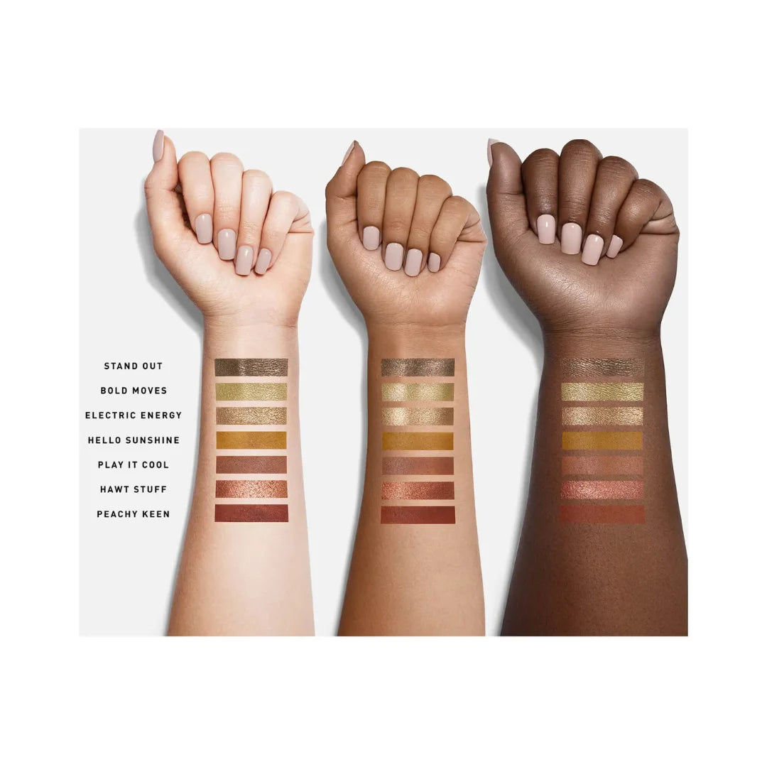 Row 2: Stand Out (metallic bronze green), Bold Moves (metallic golden pear), Electric Energy (metallic golden sage), Hello Sunshine (matte mustard green), Play it Cool (matte caramel), Hawt Stuff (metallic copper), Peachy Keen (matte toffee)