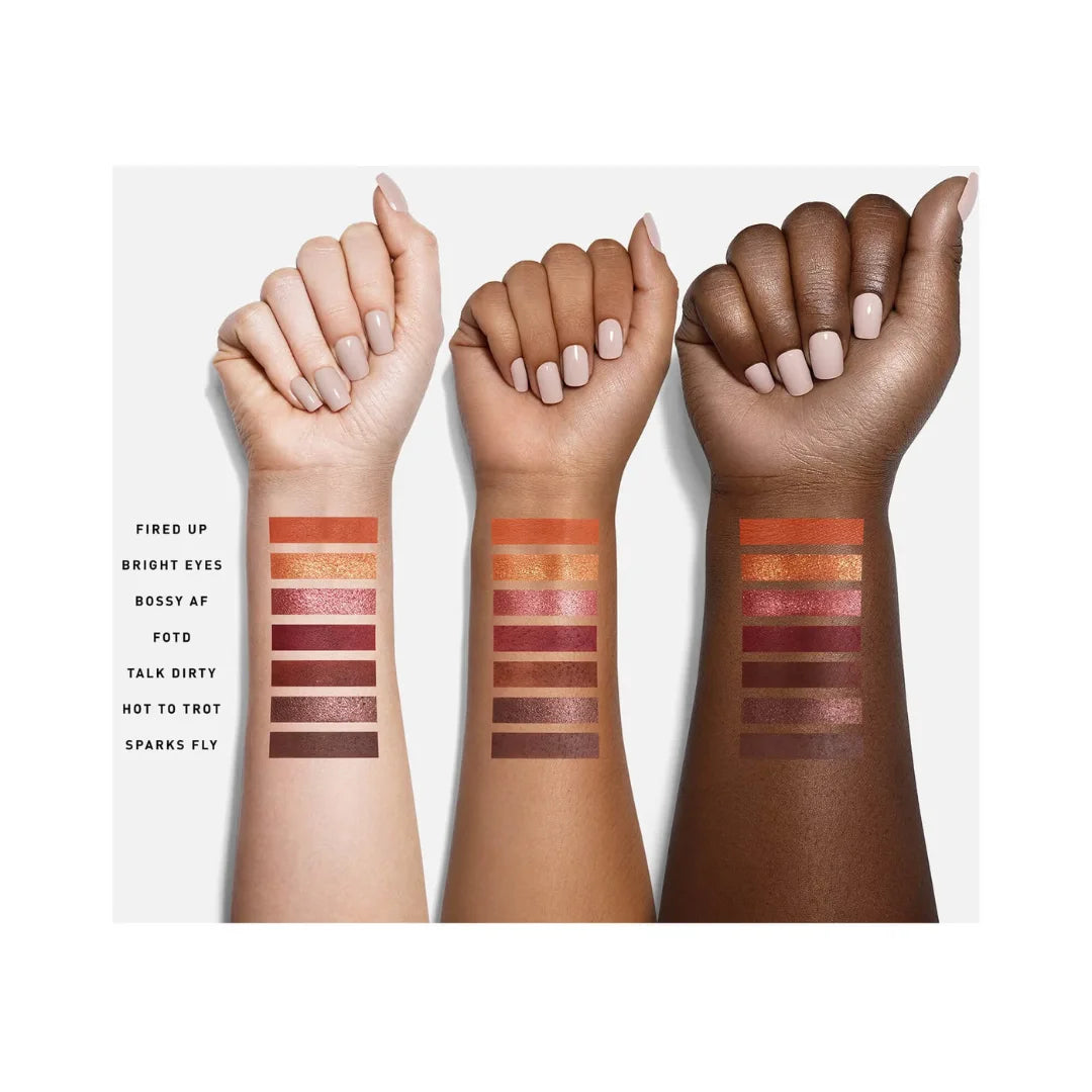 Row 3: Fired Up (matte apricot), Bright Eyes (metallic amber), Bossy AF (metallic garnet), FOTD (matte red currant), Talk Dirty (matte chocolate truffle), Hot to Trot (metallic plum bronze), Sparks Fly (matte walnut)