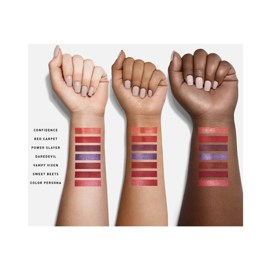 Row 4: Confidence (metallic deep coral), Red Carpet (matte raspberry), Power Slayer (matte dusty plum), Daredevil (metallic violet), Vampy Vixen (matte brick red), Sweet Beets (matte cranberry), Color Persona (metallic cranberry)