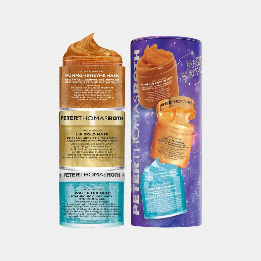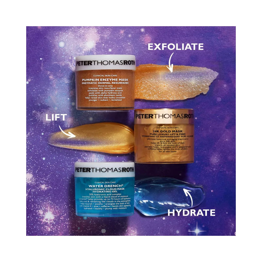 The 24K Gold mask visibly lifts and firms while imparting an opulent-looking glow. The Pumpkin Enzyme mask exfoliates and peels to address dullness and visible signs of aging. The Water Drench mask hydrates, nourishes, and visibly energizes dry, dehydrated skin.