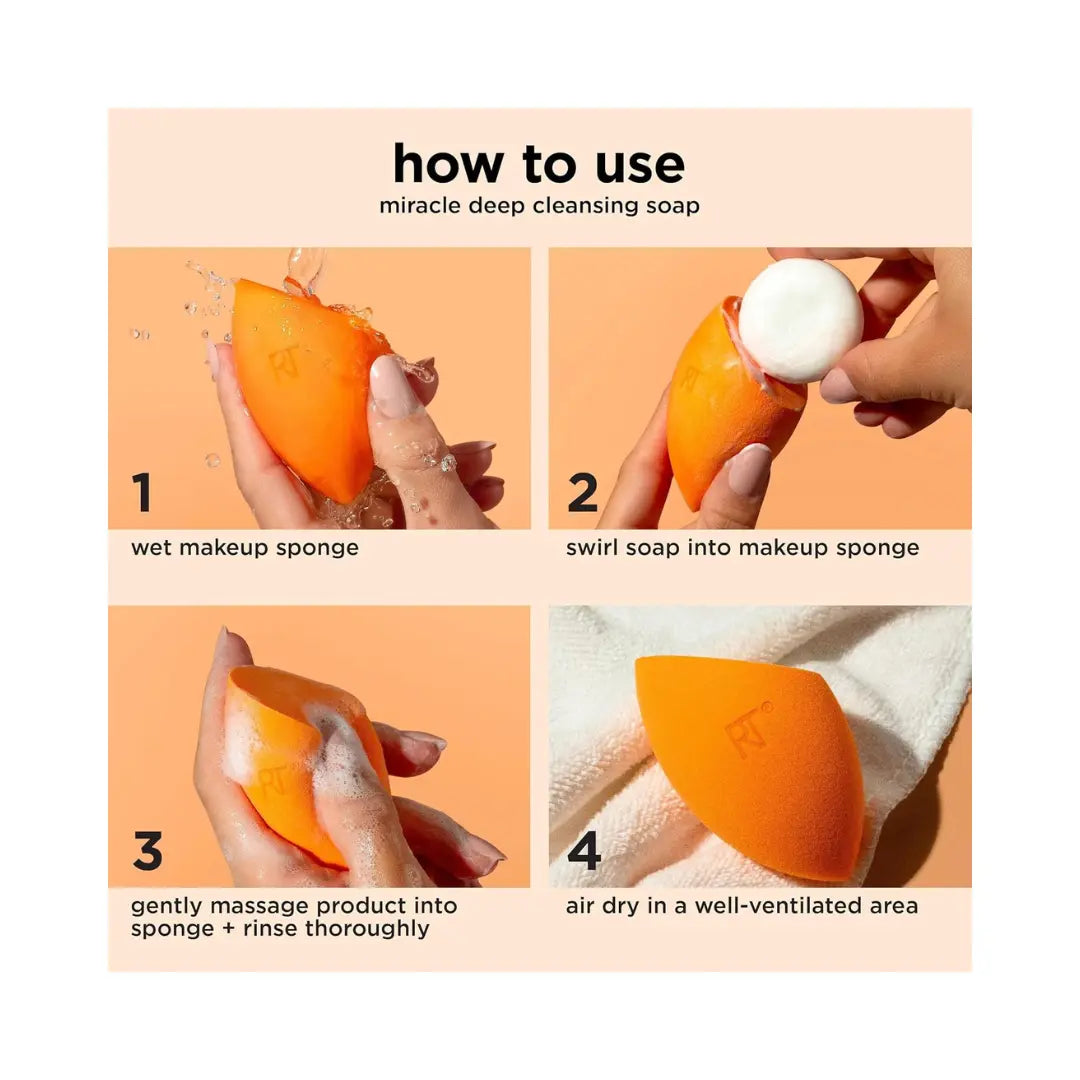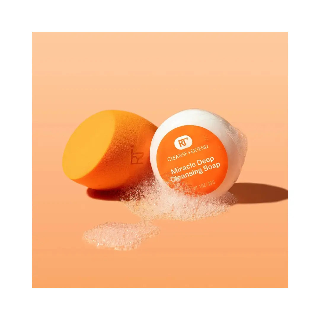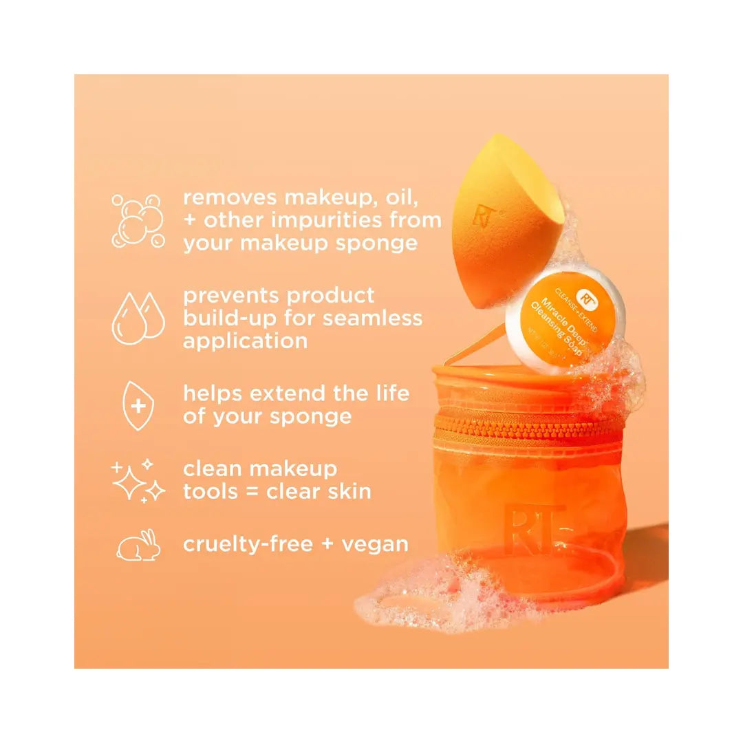 What it is: The Real Techniques Miracle Blend + Cleanse Set is a 3-piece starter cleansing set designed to make your sponges last longer and keep your blends fresh. From sponge newbies to sponge lovers - this set includes all the essentials for a clean makeup sponge. The cleansing set includes our best-selling Miracle Complexion Sponge to bounce and blend makeup all over for a lightweight natural, dewy glow. It also includes a Mini Travel Tote for on-the-go storage and the Miracle Deep Cleansing Solid Soap to gently clean your sponge. Cleaning your makeup blending sponges extends the life of your tools, helps your makeup application stay flawless, and helps your skin stay clear. Because clean tools blend better.