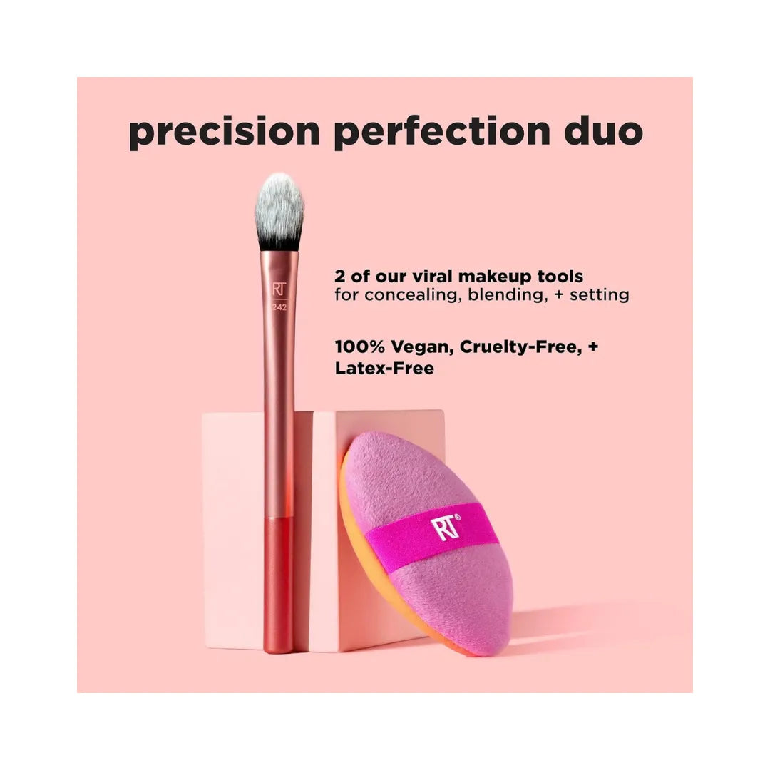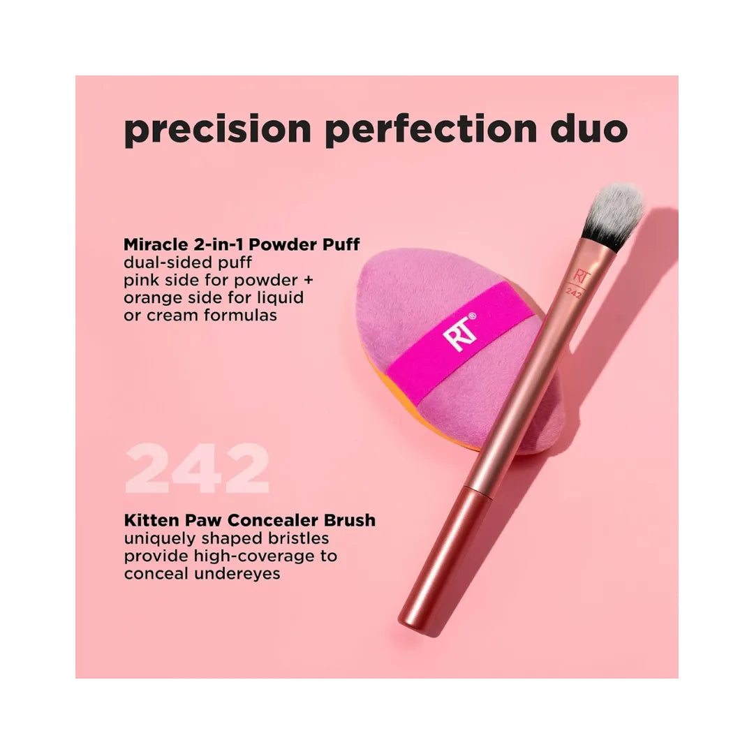 What it is: The Real Techniques Precision Perfection Duo features 2 of our viral makeup tools for concealing, blending, and setting so you can level up your blending technique. The makeup brush and puff set includes our 242 Kitten Paw Concealer Brush and Miracle 2-In-1 Powder Puff. The viral concealer brush features a unique kitten paw shape that provides high coverage to flawlessly conceal under the eyes for a lifted finish. It can be used with your favorite liquid or cream concealer. Our dual-sided powder puff features plush pink fibers that pickup and apply powder to set your base, while the orange side features our best-selling Miracle Complexion Sponge material to effortlessly blend liquid and cream formulas such as foundation and concealer. As always, the Kitten Paw brush is made with UltraPlush, high quality bristles for maximum pickup and laydown.