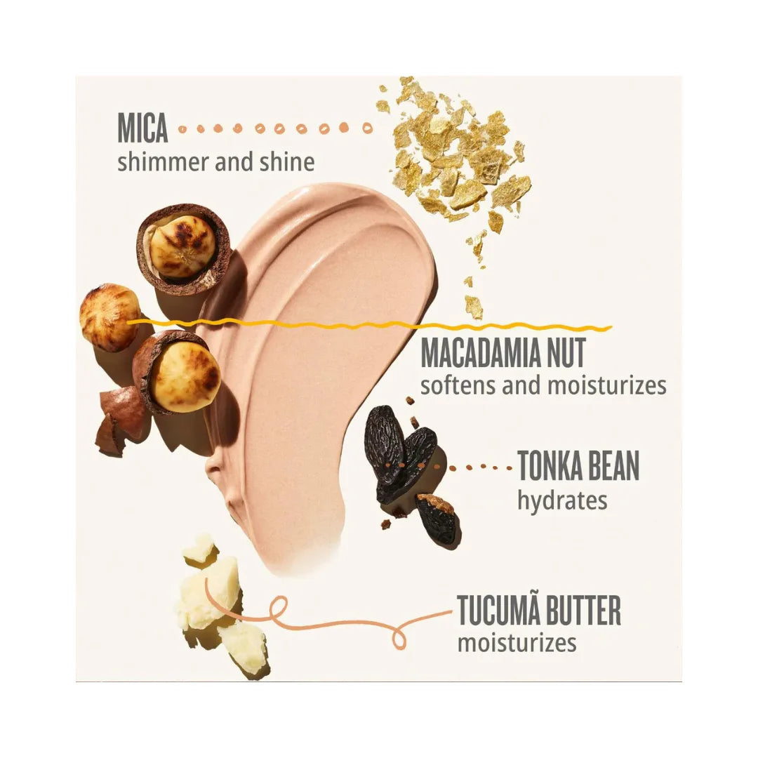 Aqua (Water, Eau), Glycerin, Caprylic/Capric Triglyceride, Cocos Nucifera (Coconut) Oil, Polyglyceryl-2 Stearate, Macadamia Ternifolia Seed Oil, Parfum (Fragrance), Astrocaryum Vulgare (Tucumã) Kernel Oil, Helianthus Annuus (Sunflower) Seed Extract, Rosmarinus Officinalis (Rosemary) Leaf Extract, Oryza Sativa(Rice) Bran Extract, Leuconostoc/Radish Root Ferment Filtrate, Lactobacillus/Dipteryx Odorata Seed Ferment Filtrate, Squalane, Ethylhexyl Olivate, Cetyl Alcohol, Phenoxyethanol, Glyceryl Stearate, Dimethicone, Stearyl Alcohol, Ammonium Acryloyldimethyltaurate/VP Copolymer, Carbomer, Caprylyl Glycol, Ethylhexylglycerin,Tetrasodium Glutamate Diacetate, Sodium Hydroxide, Cyamopsis Tetragonoloba Gum, Tocopherol, Mica, Iron Oxides (CI 77491), Titanium Dioxide (CI 77891), Benzyl Benzoate.