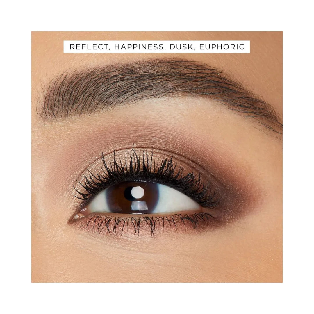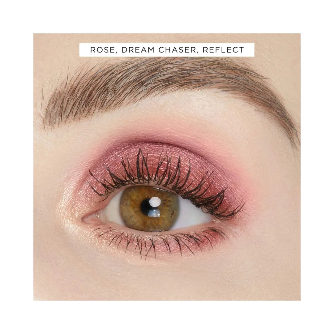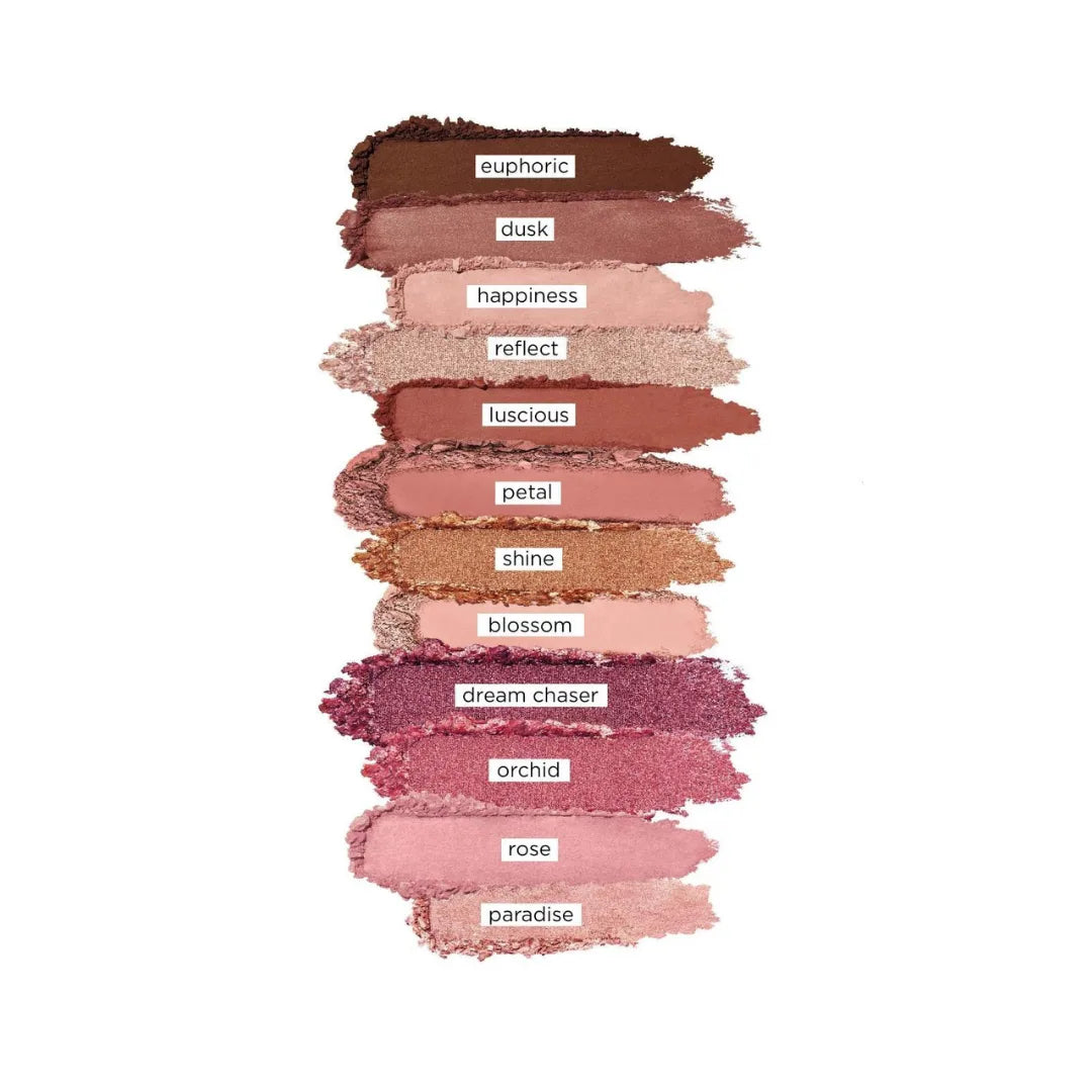 - 12 x eyeshadows in Paradise (peach champagne shimmer), Rose (matte rosy pink), Orchid (pink shimmer), Dream Chaser (pink-plum shimmer), Blossom (matte peachy pink), Shine (deep copper shimmer) Petal (matte soft rose), Luscious (matte cinnamon), Reflect (golden champagne shimmer) Happiness (matte rosy tan), Dusk (rosy-brown shimmer), Euphoric (matte cool deep brown)