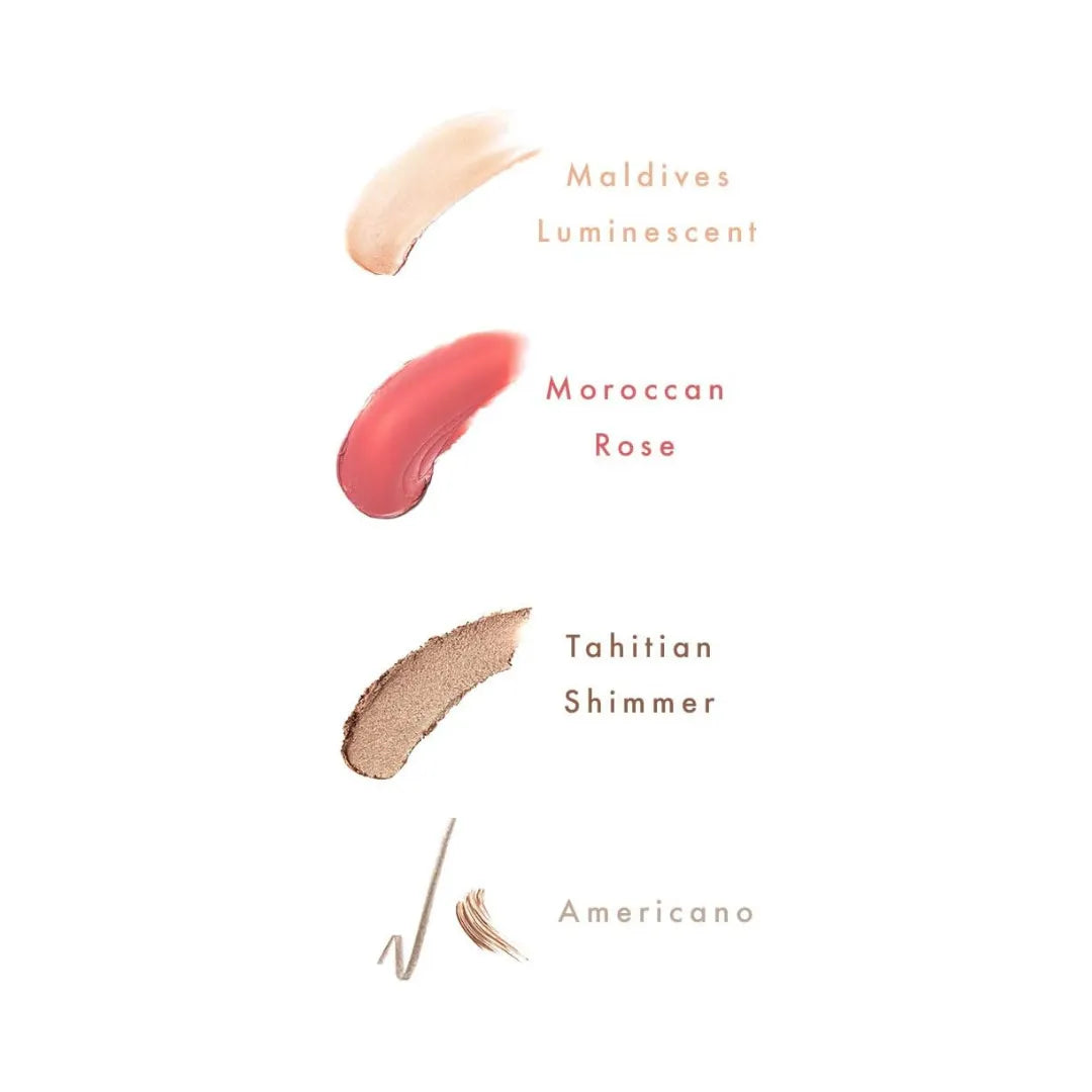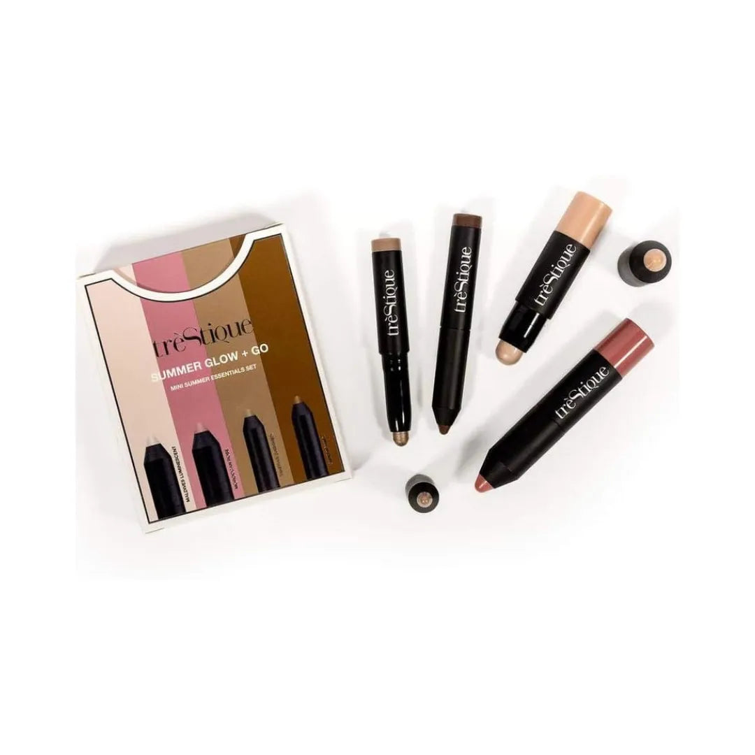 What it is: A must-have mini set to get your perfect summer glow in petite crayons. We got your summer glow covered with our Summer Glow + Go Set. This mini makeup kit features our best-selling shades to create a full makeup look. The mini highlighter brightens and accentuates with a smooth, silky feel and leaves a luminescent veil of subtle shimmer. The mini blush's lightweight cream-gel formula glides on with ease. The mini eyeshadow features an ultra-blendable, creamy texture that leaves lids glistening with the perfect shimmering neutral shade. The mini brow definer easily creates naturally defined, full brows.
